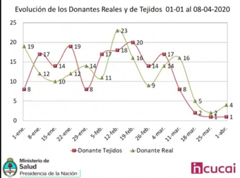 En Argentina, aún con poco más de 2000 infectados y 100 muertes por coronavirus en el país, en el mes de marzo ya se registraron disminuciones en donantes. Luego de registrarse a nivel nacional en enero 62 donantes reales y 69 en febrero; en marzo fueron solo 48 y en los primeros 14 días de abril 9. También se dio una baja significativa en la cantidad de trasplantes. Mientras tanto, son más de 8800 los argentinos que esperan en la lista del Incucai.