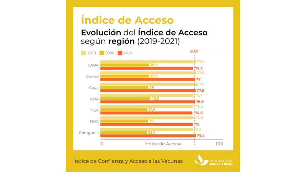 Las regiones del país con mayor acceso a vacunas en 2021 fueron Cuyo (77,6); Patagonia (77,4) y región Centro (77). Y las regiones con menos acceso NEA (74,6); NOA (75) y CABA (75,3). Al comparar el acceso a las vacunas en 2019 con el actual, los únicos cambios significativos se observan en la región patagónica y GBA. En ambos casos hubo un leve aumento del acceso: en Patagonia creció un 2,9% (tenía 75,2 en 2019) y en GBA, un 1,6% (tenía 75,7 en 2019).