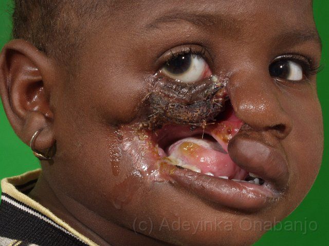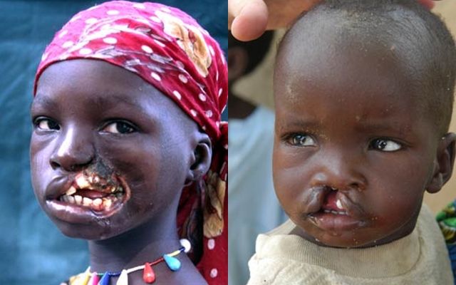 Comienza como una simple llaga en las encías y rápidamente se convierte en una gingivitis necrosante y ulcerosa que perfora los músculos, la piel y los huesos. Los afectados desprenden un olor fétido. La OMS calcula que 140.000 niños contraen el noma cada año. Si no reciben tratamiento antibiótico, el 90% de ellos muere, muchos ya sin nariz y con un agujero en la cara que deja a la vista su mandíbula. Los que sobreviven quedan desfigurados de por vida.
