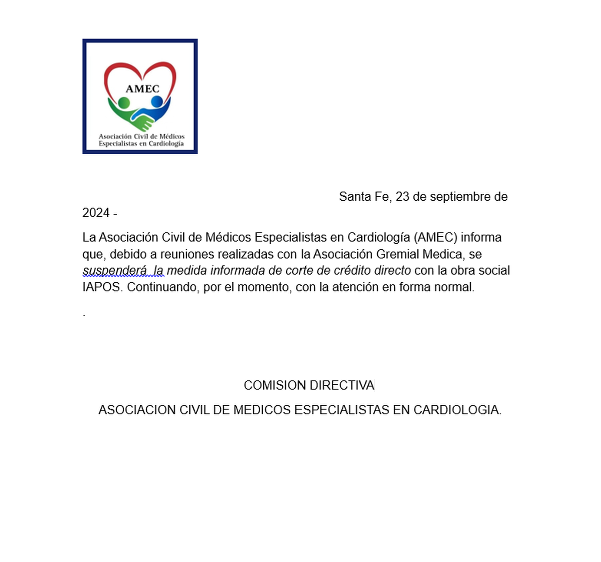 Los cardiólogos nucleados en la Asociación Civil de Médicos Especialistas en Cardiología (Amec) dieron marcha atrás con la posibilidad de atender bajo reintegro a los afiliados de Iapos de Santa Fe.