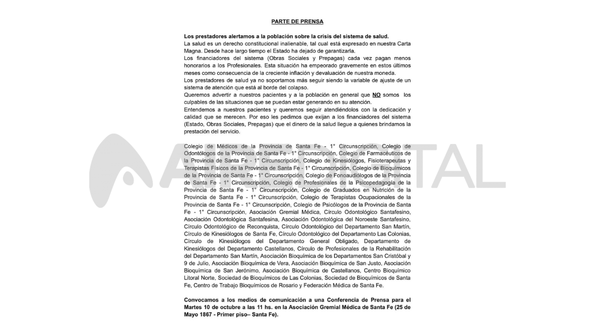 Más de 30 entidades que nuclean a profesionales de la salud de distintas áreas se reunieron para manifestar su preocupación por la crisis que atraviesa el sistema de salud en Santa Fe y todo el país. Asimismo advirtieron que el impacto de costos ponen en jaque algunas de las actividades como es el caso de bioquímicos y odontólogos.