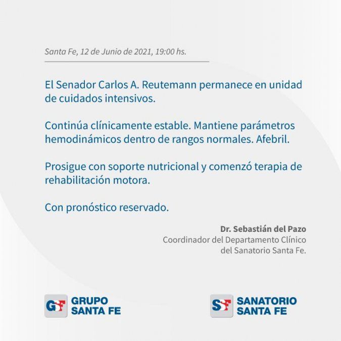 El equipo médico detalló que el ex piloto de Fórmula 1 está "clínicamente estable", los parámetros hemodinámicos están "normales" y no presenta episodios febriles. Además, indicaron que continúa con "soporte nutricional" y comenzó a realizar "terapia rehabilitación motora".
