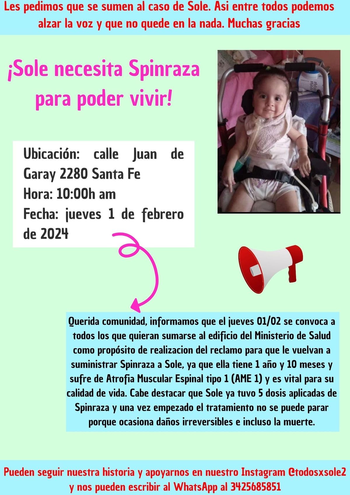 Una vez que recibió el diagnóstico, Sole comenzó consumir Spinraza, una medicación costosa que no cura la enfermedad, pero mejora la calidad de vida de la nena y se aplica cada cuatro meses.