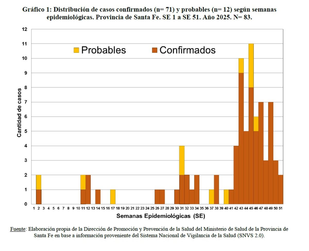 La distribución semanal mostró un comportamiento irregular en la primera parte del año, con casos aislados en distintas semanas. El cambio más marcado llegó sobre el tramo final: desde las SE 42 a 50, el gráfico evidencia un salto sostenido en la notificación de confirmados y probables.