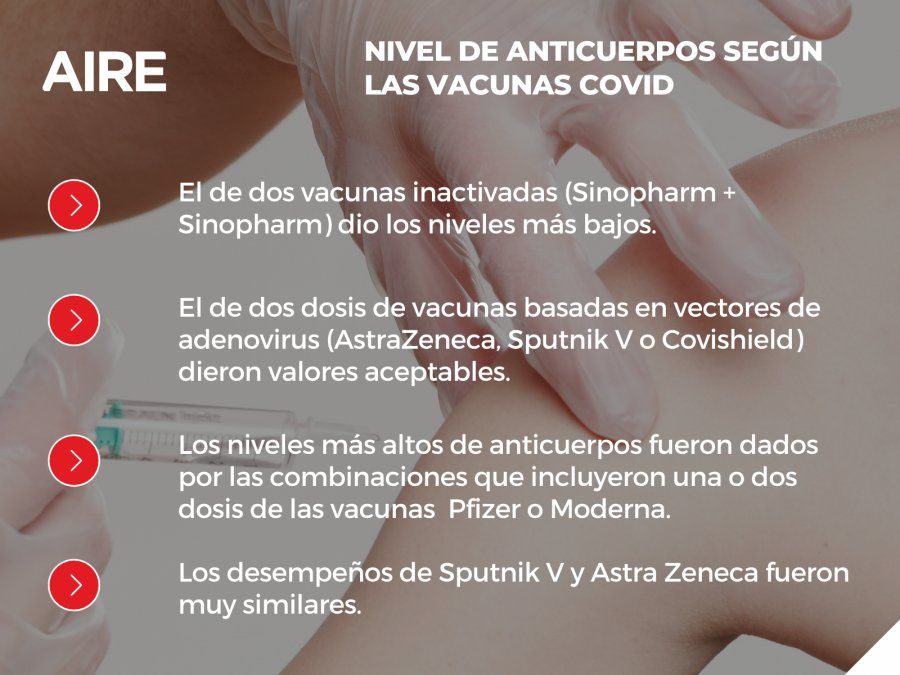 Quienes tienen dos dosis de vacunas inactivas, es decir, Sinopharm, tienen los niveles más bajos de anticuerpos. Las personas que recibieron vacunas basadas en vectores de adenovirus como AstraZeneca, Sputnik V o Covishield, tienen valores de anticuerpos aceptables más altos que los de las vacunas inactivadas. El informe destaca que los desempeños de Sputnik V y AstraZeneca fueron muy similares.
