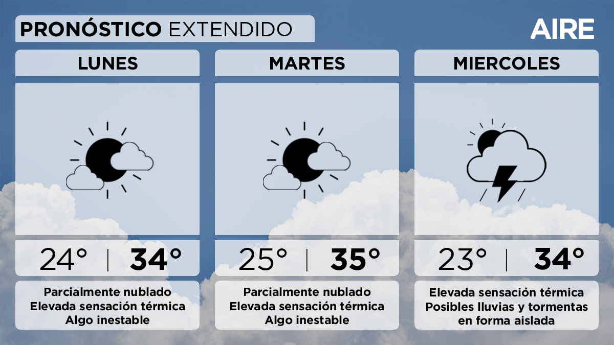 - Miércoles: serán más inestables las condiciones, con mayores probabilidades de lluvias y tormentas, pero mejorando hacia la noche. Temperatura mínima de 23°, máxima de 34° y viento leve a moderado del sudeste.