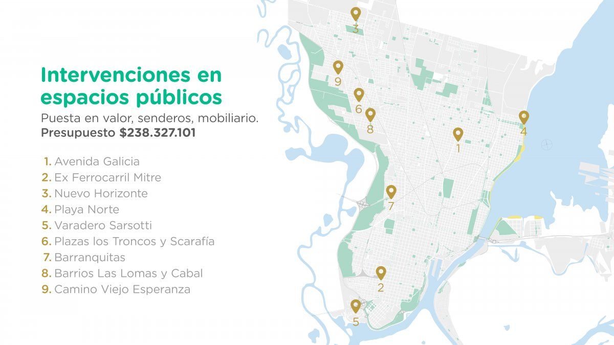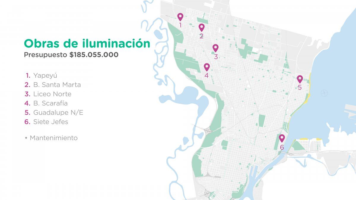 Además, el intendente también anunció obras de iluminación para los barrios Yapeyú, Santa Marta, Liceo Norte, Scarafía, Guadalupe (noreste) y Siete Jefes, con un presupuesto de $185.055.000; e intervenciones en los espacios públicos, que incluyen la puesta en valor de senderos y mobiliario, para avenida Galicia, el ex ferrocarril Mitre, Nuevo Horizonte, Playa Norte, Varadero Sarsotti, plazas de Los Troncos y Scarafía, Barranquitas, Las Lomas, Cabal y Camino Viejo a Esperanza, con un presupuesto estimado de $238.327.101.