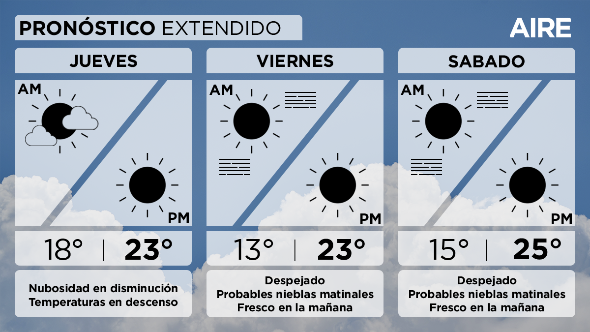 Este jueves 21 de marzo se presenta con nubosidad en disminución, esperando cielo despejado por la tarde. Temperaturas también en descenso con mínima de 16° a final de la jornada, máxima de 23° y viento leve a moderado del sur con posibles ráfagas de mayor intensidad.