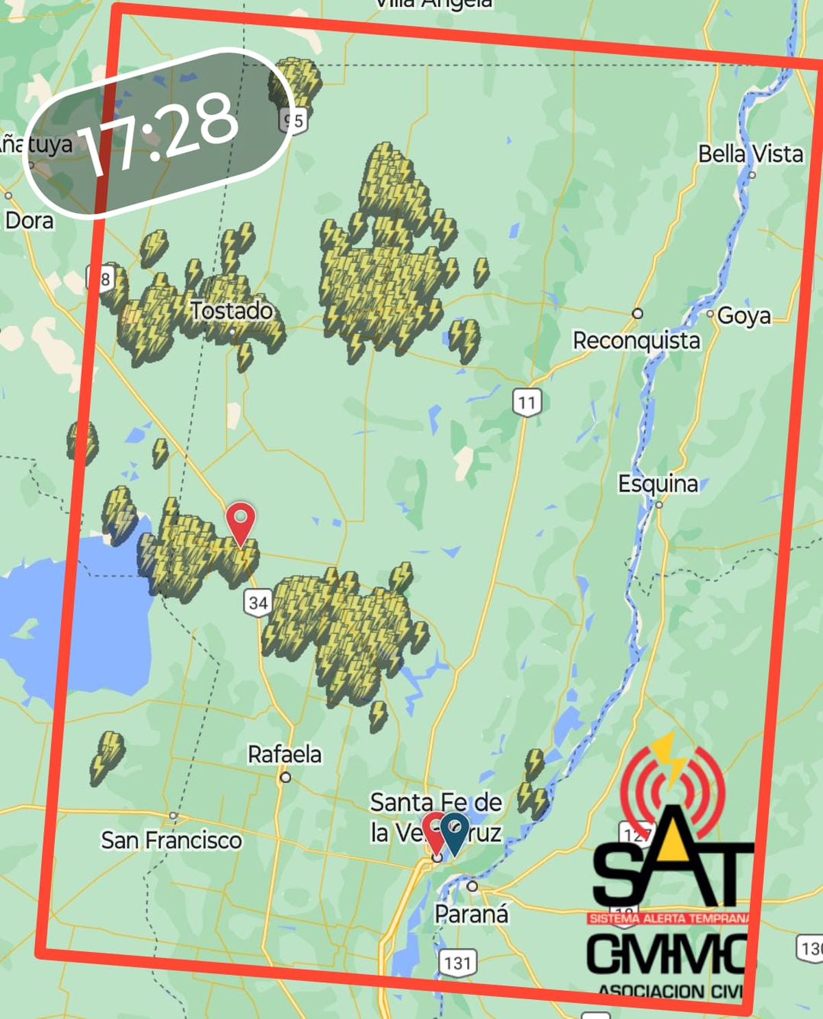 El Centro de Monitoreo Meteorológico y Climático SAT Santa Fe emitió un alerta para las localidad de Esperanza, Llambi Campbell, Laguna Paiva, Santa Rosa de Calchines, Santa Fe, Paraná (ER), Santo Tomé, Sauce Viejo, Franck y alrededores por actividad eléctrica de rápido desarrollo en la zona.