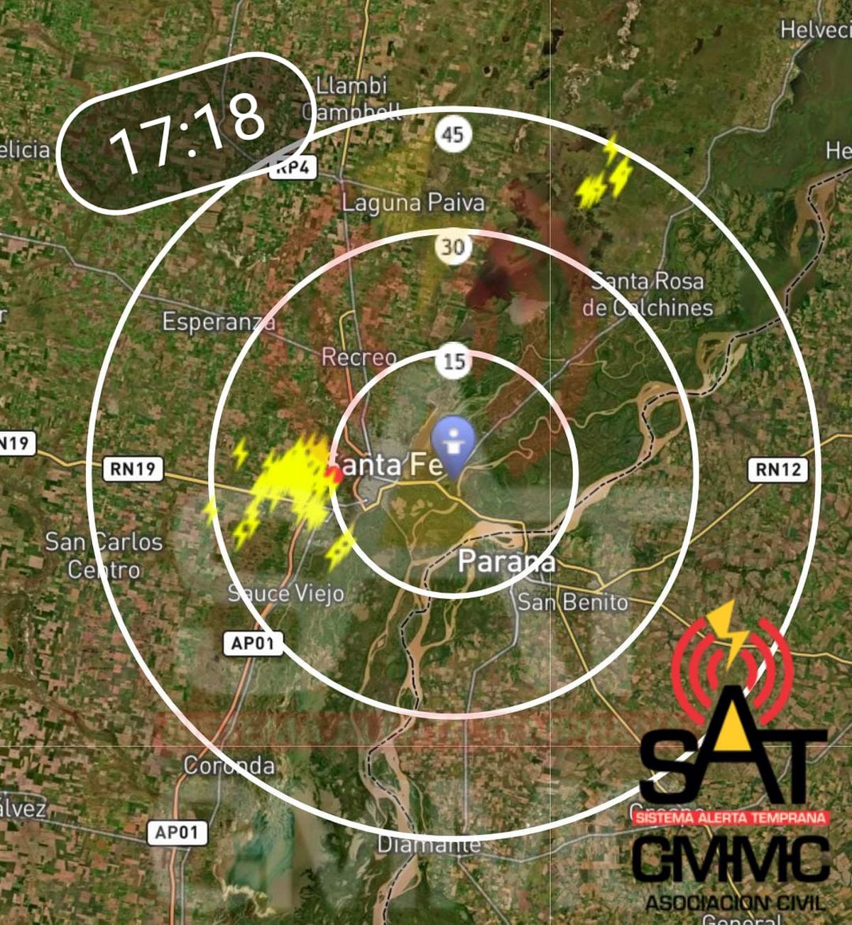 El Centro Monitoreo Meteorológico y Climático SAT lanzó un aviso para la ciudad de Santa Fe, Santo Tomé, Recreo, Paraná (ER) y alrededores por actividad eléctrica con rápido desarrollo en la zona.