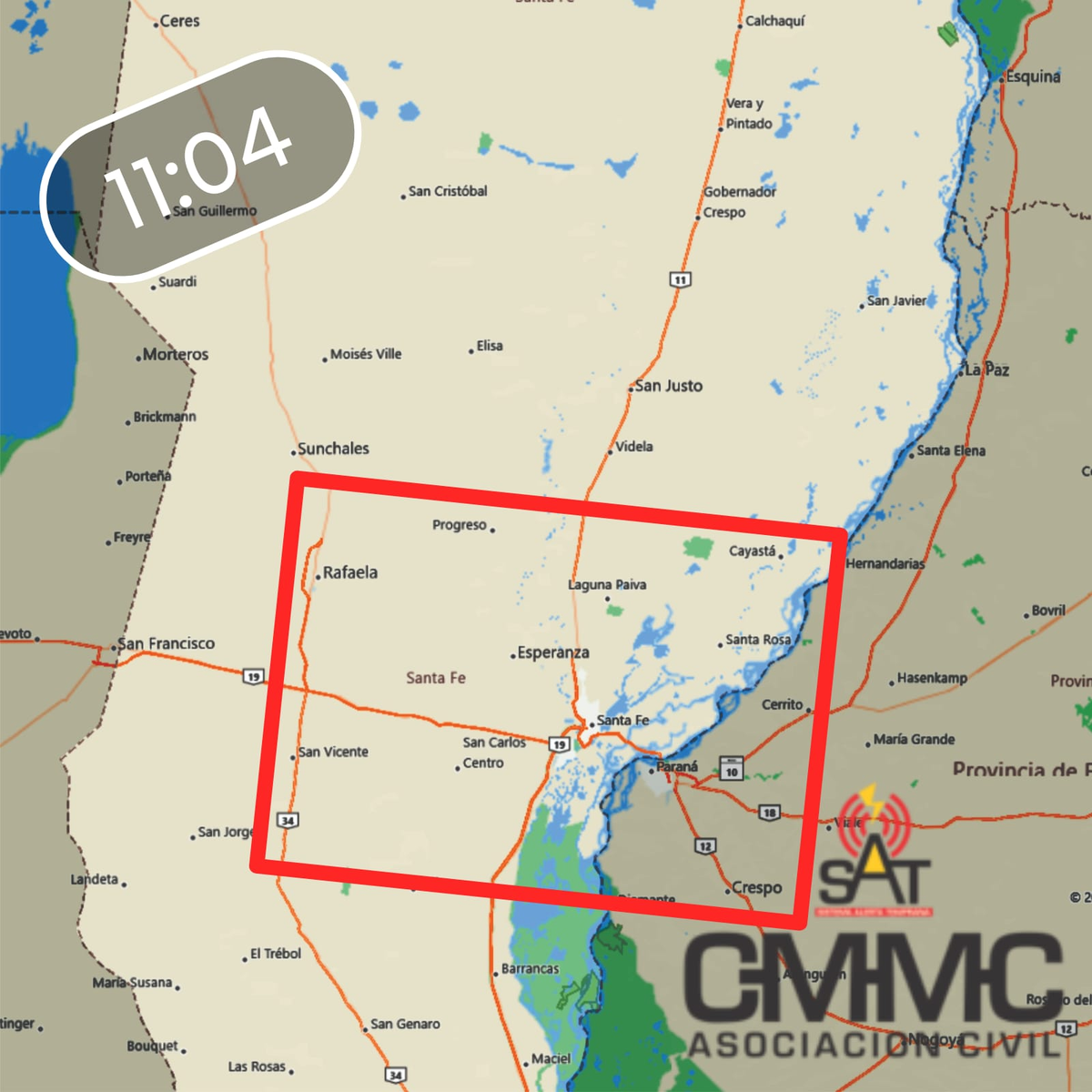El aviso, que fue lanzado a las 11:04, tiene una duración de una hora y abarca además a las localidades de Pilar, Laguna Paiva, Rafaela, Cayastá, Coronda y alrededores.
