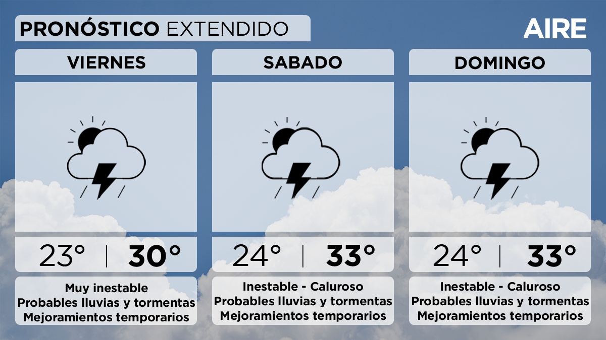 Pero también es posible que se reactiven las tormentas debido a que continúa sin ingresar aire frío, lo que mantiene la masa de aire cálido, húmedo y muy inestable en la región. Esta situación persistirá hasta el martes, cuando llegue el frente frío. Ese día comenzarán a mejorar las condiciones de una manera más firme, con un descenso de temperaturas desde el lunes.