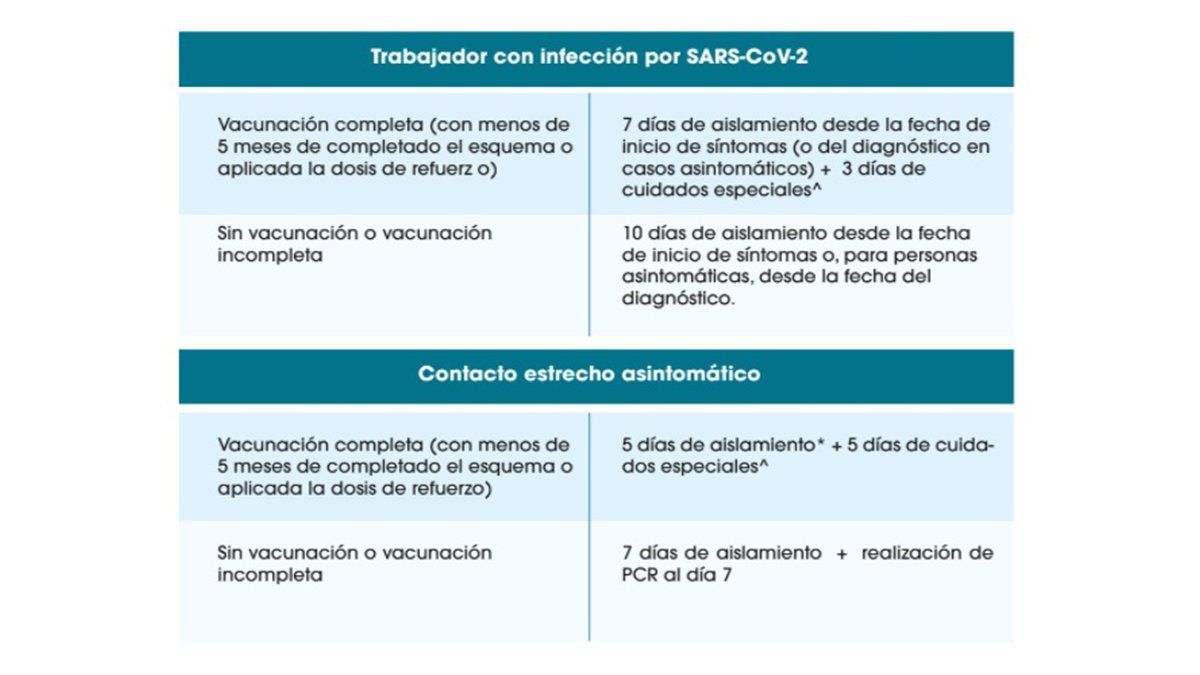 AMRA hizo referencia a la normativa publicada por el Gobierno provincial bajo el título "Nuevas disposiciones de aislamiento", que establece para el personal de salud que "si la demanda sanitaria es alta y tiene esquema completo de vacunación no requiere aislamiento y sí cuidados especiales con barbijo N95 y considerar testeo al día 5".