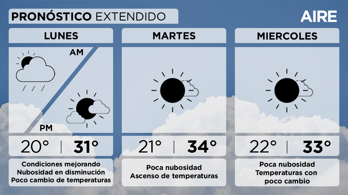 El lunes se prevé nubosidad en disminución con temperaturas oscilando entre los 20°C y 31°C, con vientos leves a moderados del noreste. El martes y miércoles se esperan cielos más despejados con temperaturas en aumento, rondando entre los 21° y 34°, acompañadas por vientos cambiantes.