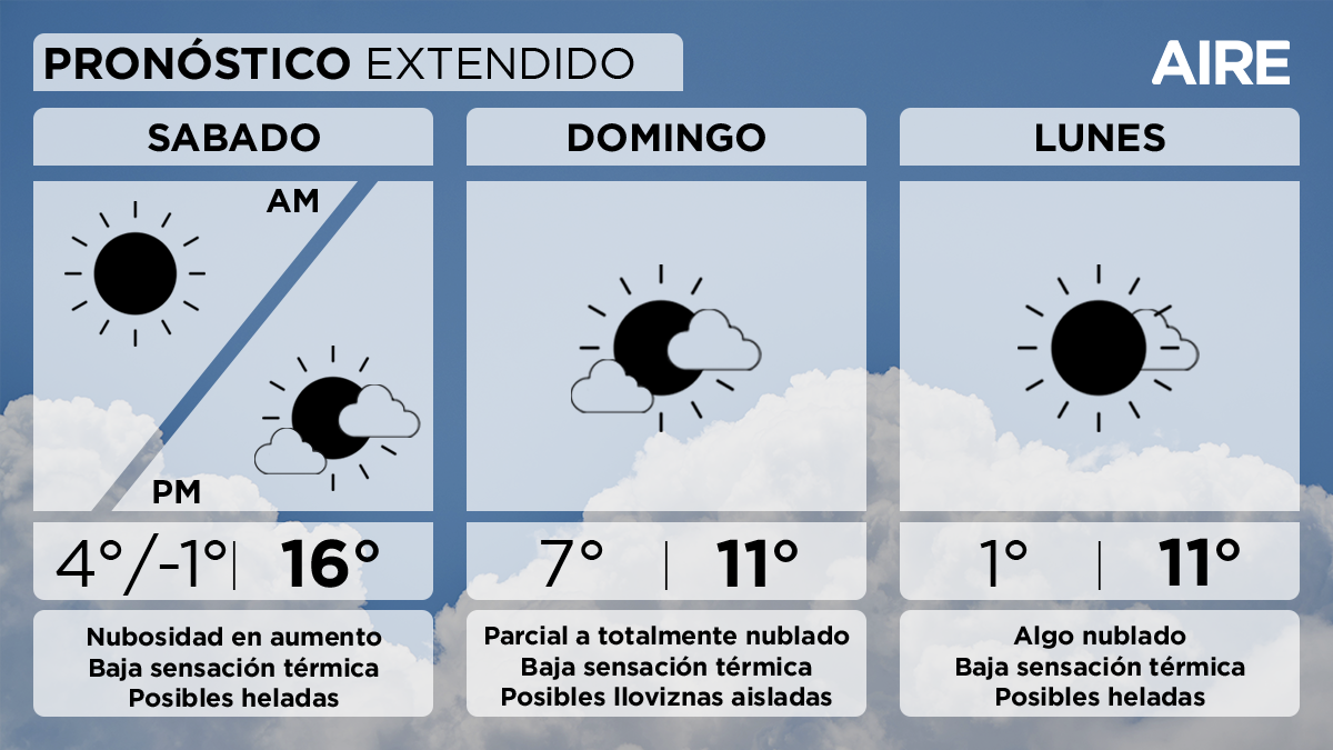 Esto se prolongará en la mañana del sábado, registrando bajas temperaturas y posibles heladas nuevamente. Sin embargo, se espera que los valores puedan ser levemente más elevados que los de hoy, debido al viento del noreste. En el transcurso de la tarde comenzará a aumentar la nubosidad, lo que limitará las mínimas para el domingo.