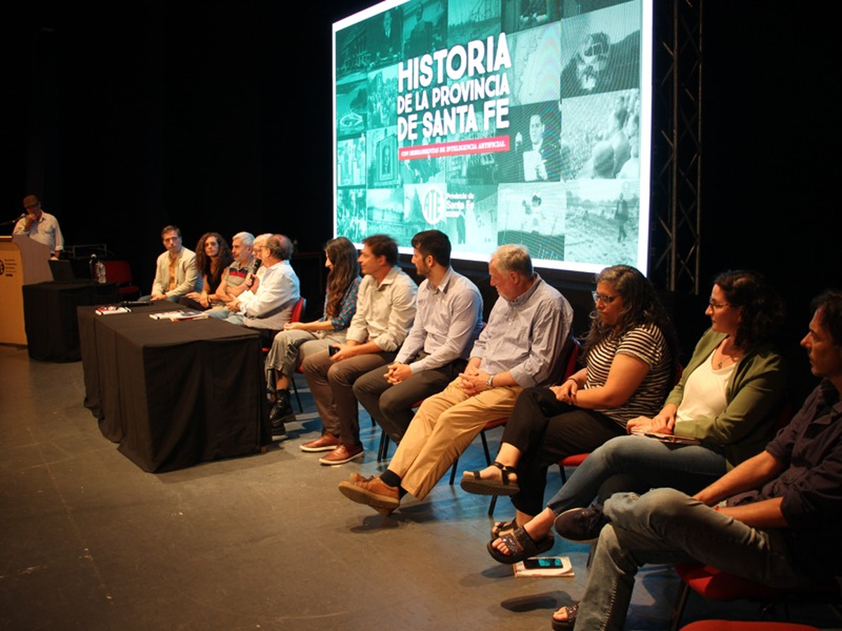 La presentación de la integración de la Inteligencia Artificial a la Megaproducción "Historia de la Provincia de Santa Fe" tuvo lugar en un evento realizado en el Centro Cultural ATE Casa España. Dieron el recibimiento a los participantes integrantes del Consejo Directivo Provincial, Silvia Gónzalez, Ana Laura Gorosito, Adolfo Avallone, Marrcelo Delfor y Jorge Hoffmann.