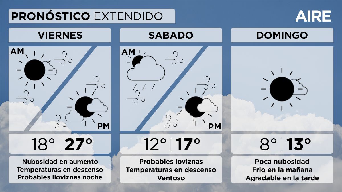 El domingo se espera poca nubosidad. La temperatura mínima será de 8° y la máxima de 13°, con viento leve a moderado del sur.