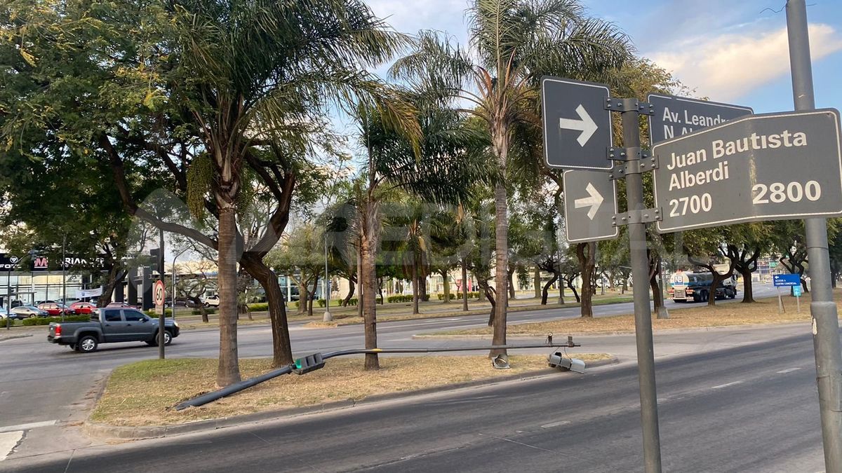 El vehículo que dobló en la esquina podría haber equivocado el radio de giro y llevó por delante la columna que sostiene la señal de tránsito. Quienes circulan por colectora de avenida Alem con sentido hacia Juan Bautista Alberdi se quedaron sin luces que les habilite el paso.