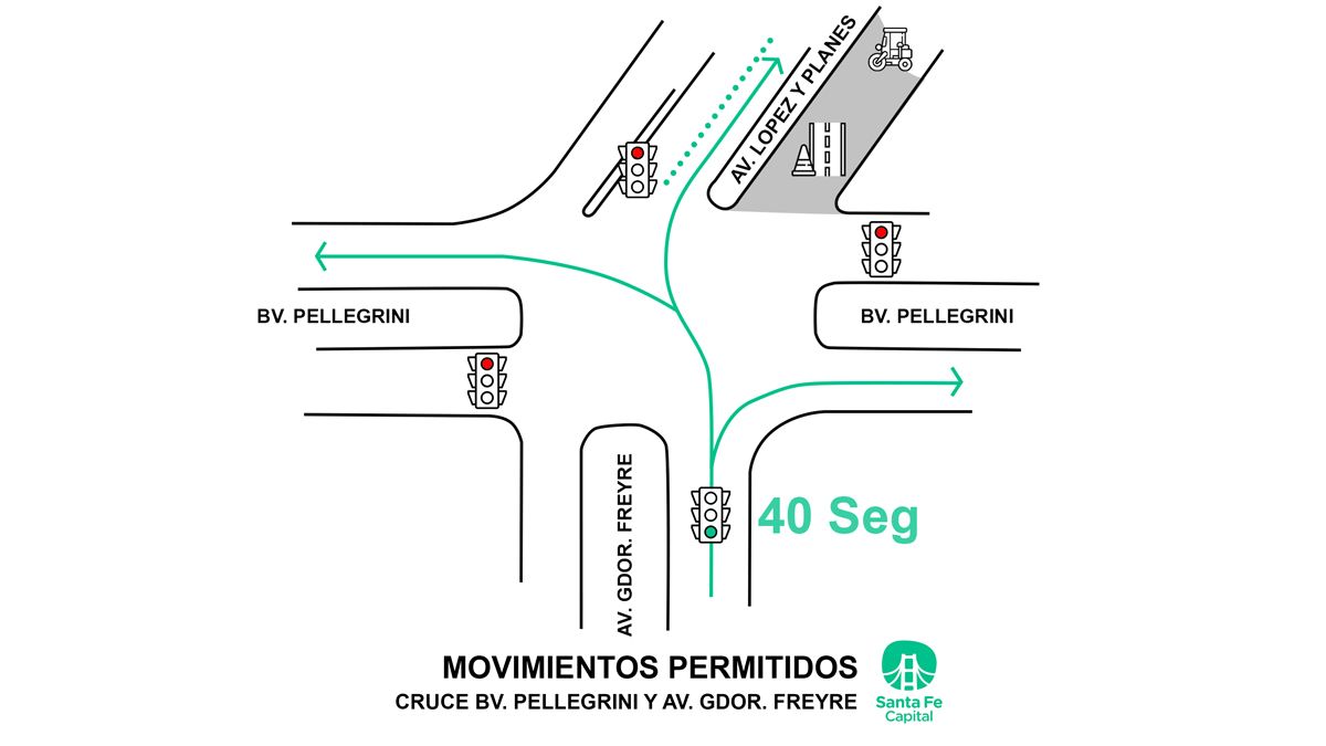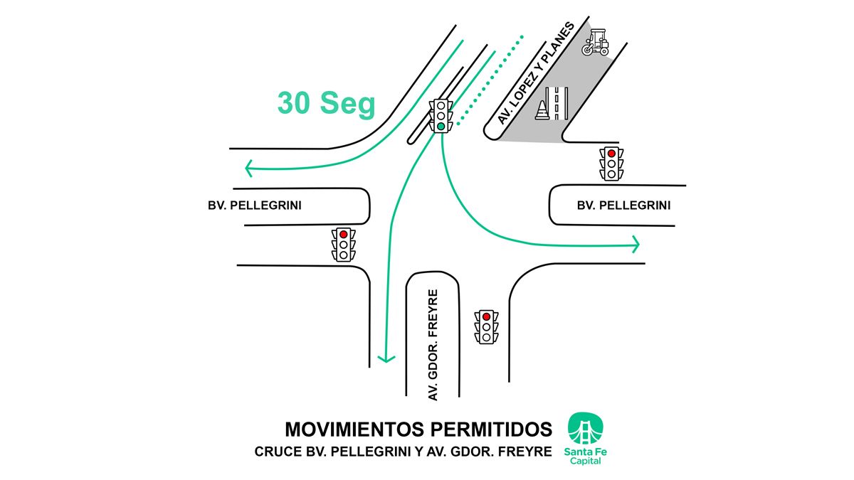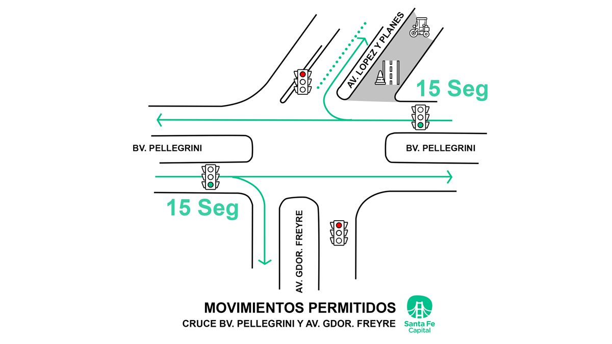 Cuando se circula por bulevar Pellegrini de este a oeste, o viceversa, se dispuso 15 segundos de paso y solo se podrá continuar por la misma dirección o doblar a la derecha, y no a la izquierda. En esta circulación actualmente se implementa un paso temporario hacia el norte que será regularizado una vez que se habilite el tramos de avenida López y Planes entre bulevar y Cándido Pujato del cual depende actualmente el final de obra previsto para principios de abril.