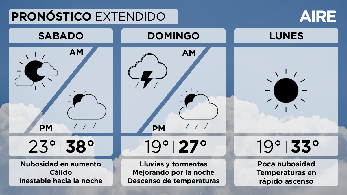 El domingo, producto del mal tiempo, la máxima alcanzaría solo los 28°, pero desde el lunes ya tendría 33° y se recuperarán rápidamente los valores. Así, para el siguiente fin de semana las máximas podrían estar entre los 38° y los 40°, con buenas condiciones durante toda la semana.