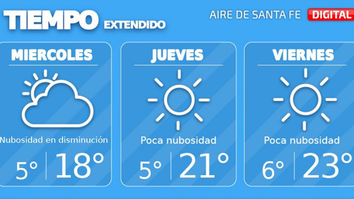 "El efecto de esta última mantiene el cielo despejado en las provincias de Río Negro, Neuquén, Buenos Aires, prácticamente todo Cuyo, el sur de Córdoba y el extremo sur de Santa Fe. Por lo antes mencionado, se espera que en el transcurso del miércoles la nubosidad disminuya en nuestra zona, con una temperatura máxima de 18°", adelantó Pablo Lucero, especialista en clima de Aire de Santa Fe.