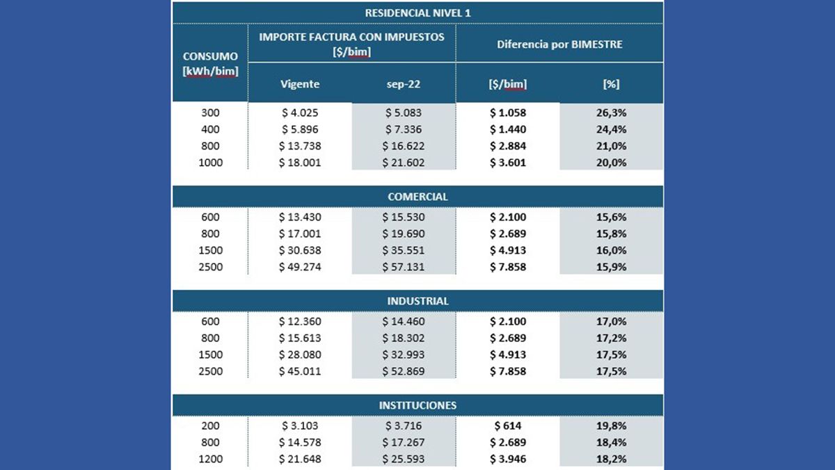 Mientras se aguarda por la información faltante y se esperan los nuevos recortes en los subsidios a la generación de la energía durante los próximos bimestres, la EPE elaboró un cuadro comparativo sobre cuál será el primer impacto de los cambios a partir de este 1 de septiembre para clientes domiciliarios de Nivel 1, industrias, comercios e instituciones.
