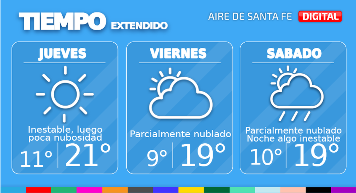 Tras la tormenta en la ciudad de Santa Fe, el jueves comenzará la jornada con condiciones algo inestables, con probabilidad de algunas precipitaciones o bancos de niebla, pero mejorando rápidamente en el transcurso de la mañana. Temperatura mínima de 14° por la mañana, 11° a finales del día, máxima de 21° y viento leve a moderado del sur con posibles ráfagas fuertes.