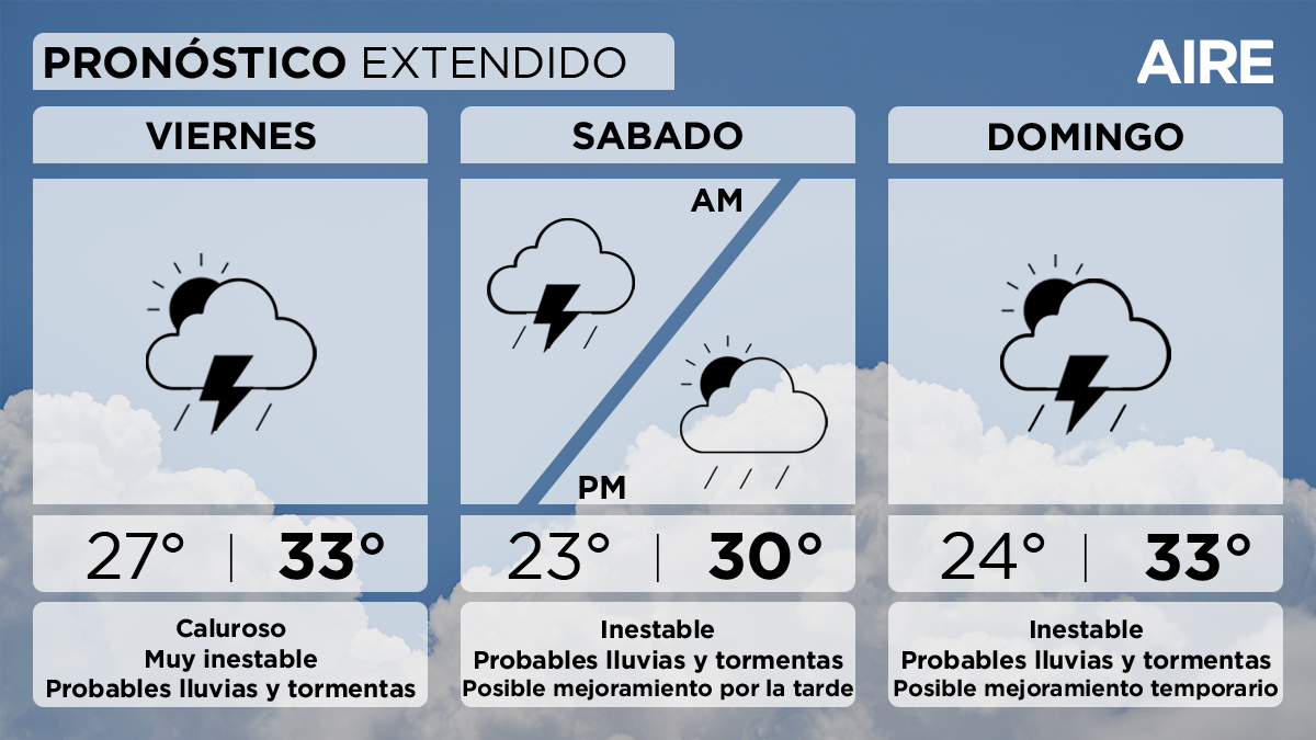 Este viernes tendremos las condiciones aún más inestables, siendo más probables lluvias y tormentas, sobre todo desde la tarde. Temperatura mínima de 24° hacia el final de la jornada, 27° por la mañana, máxima de 33° y viento leve a moderado del noreste rotando al sur hacia la noche.