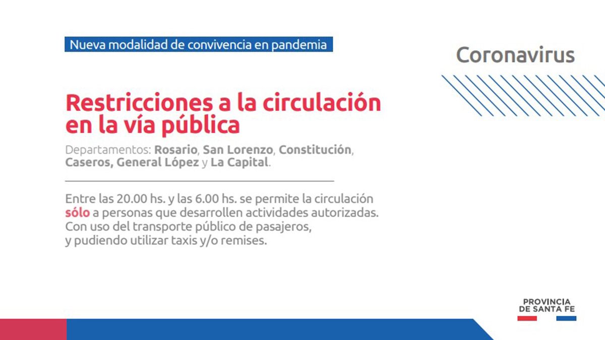 A través de artículo 4 del nuevo decreto N° 1010 establece que en todas las localidades de los departamentos Rosario, Caseros, Constitución, General López, San Lorenzo y La Capital la circulación en la vía pública entre las 20 y las 6 queda "estrictamente" restringida a la necesaria para desarrollar las actividades habitadas en el documento y anteriormente, haciendo uso del transporte público , o del servicio de taxis y remises.