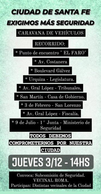La marcha partirá del Faro de la costanera con destino a Legislatura, Tribunales, Casa de Gobierno, Fiscalía y concluirá frente al Ministerio de Seguridad. Si bien el volante convoca a las 14, Tira aclaró que aún no está confirmado el horario de partida de la caravana.