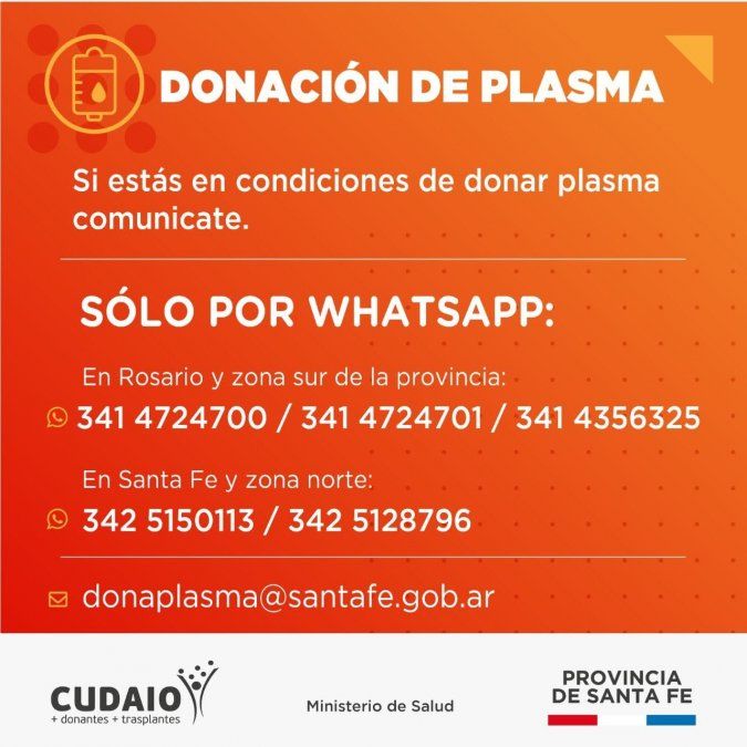 Con la curva de contagios en ascenso la demanda de unidades de plasma es, también, creciente. En este sentido, desde CUDAIO, organismo oficial a cargo del ensayo, se reitera la convocatoria para que los santafesinos que han cursado la enfermedad, y han recibido el alta, donen plasma. Al mismo tiempo, en Santa Fe se registran cada vez más personas recuperadas de covid-19, muchas de las cuales reúnen las condiciones para ser donantes, aunque hay un tiempo que esperar para hacerlo y se deben realizar estudios previos.