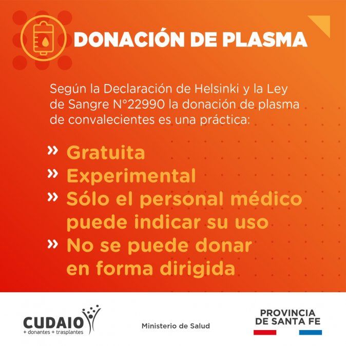 Finalmente el subdirector del Cudaio recordó que la donación de plasma es un acto voluntario: "Nadie puede obligarlos y es desinteresado", dijo. De acuerdo a lo expresado en la Ley de Donación de Sangre N° 22990 y distintas resoluciones ministeriales, la donación de plasma covid-19 es gratuita, su uso es experimental y sólo puede ser indicado por personal médico. Además, no se puede donar en forma dirigida, es decir, que el donante decida para quién dona.