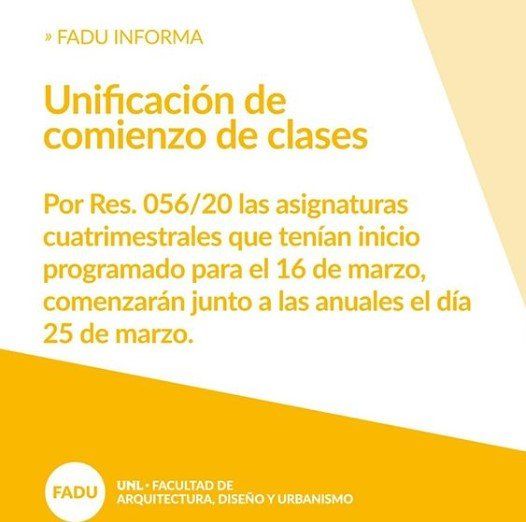 Desde la Facultad de Diseño, Arquitectura y Urbanismo (FADU) se informó que, por Resolución 056/20, se unificará el comienzo de clases. Las asignaturas cuatrimestrales que tenían inicio programado el 16 de marzo, comenzarán junto a las anuales el 25 de marzo. Por otra parte, para los docentes y personal mayor de 65 años, se sugirió autoaislamiento social y trabajo virtual.