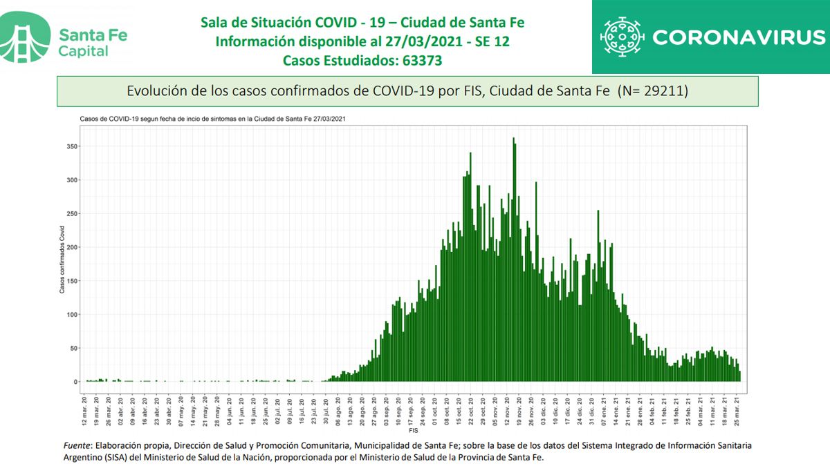 A esa fecha, la ciudad acumulaba 29.211 casos de covid confirmados, con una positividad del 46,1%. De estos, 1.672 son casos activos; siendo el porcentaje de recuperación del 94%. La edad promedio de contagio es de 39 años y el 53,7% de las personas infectadas son mujeres y el 46,3% varones. El total de fallecidos desde el inicio de la pandemia es de 392 personas en la ciudad, con una edad promedio de 76 años. En la última semana (del 20 al 27 de marzo) los nuevos casos confirmados fueron 392 y las defunciones 2.