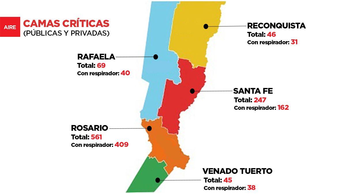El mayor número de camas críticas y respiradores se encuentran en la región Rosario (departamentos Belgrano, Iriondo, además de San Lorenzo, parte de Caseros –Distrito Casilda–, Rosario, San Martín, San Jerónimo, y Constitución). En total suma 561, de las cuales 149 son del sistema público y 412 privadas. De estas, las que cuentan con respirador son 409.