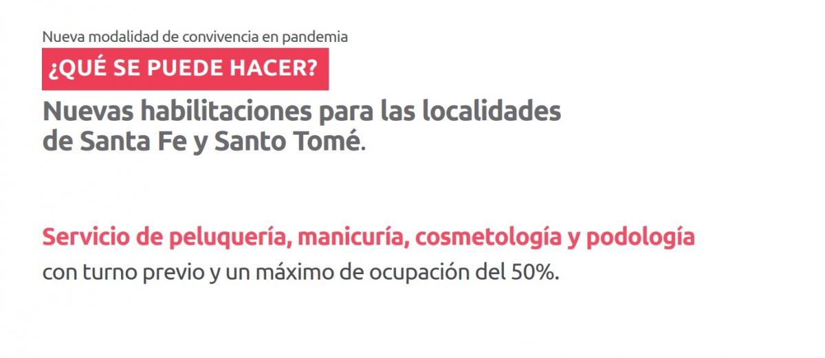 Mientras que en el sur de la provincia de Santa Fe, donde se registra la mayor cantidad de contagios de coronavirus desde la llegada de la pandemia, todo seguirá igual que en los últimos 14 días, en las ciudades de Santa Fe y Santo Tomé podrán volver a funcionar los rubros de peluquería, cosmetología, manicuría y podología desde el sábado con turno previo y un máximo de ocupación del 50%