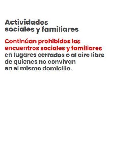 Continúan prohibidos los encuentros sociales y familiares en lugares cerrados o al aire libre de quienes no convivan en el mismo domicilio.