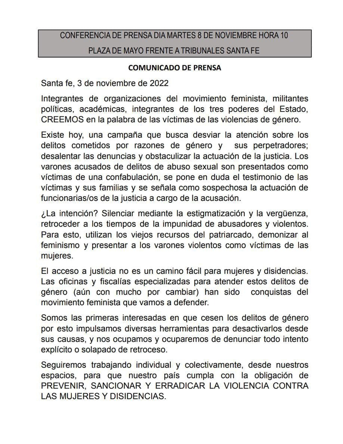 En tanto indicaron que “los varones acusados de delitos de abuso sexual son presentados como víctimas de una confabulación, se pone en duda el testimonio de las víctimas y sus familias y se señala como sospechosa la actuación de funcionarias y funcionarios de la justicia a cargo de la acusación. Creemos en la palabra de las víctimas de las violencias de género”, enfatizaron.