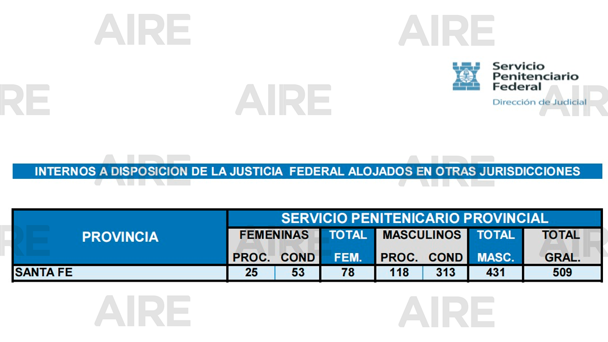El debate sobre dónde se ubican los presos es algo habitual en el mundo político. AIRE pudo acceder a un documento brindado por la Subsecretaría de Asuntos Penitenciarios en el que se detalla que al 21 de junio 509 internos e internas que están a disposición de la justicia federal se encuentran alojados en establecimientos del servicio penitenciario provincial.
