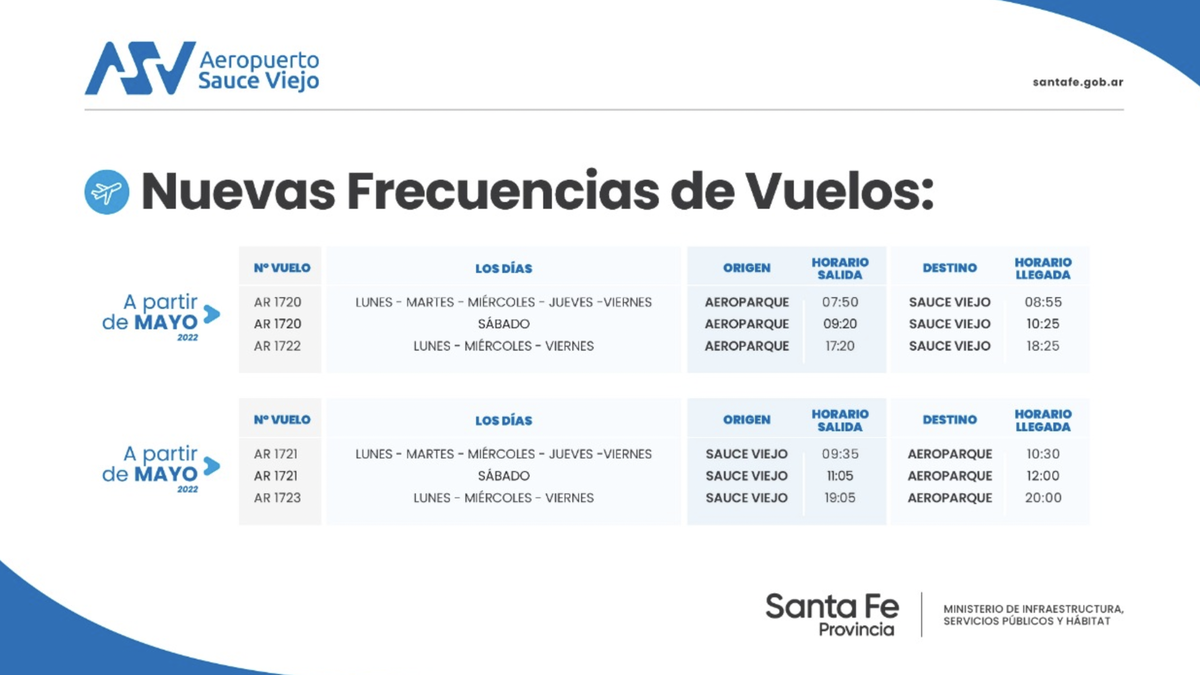 "La nueva programación ofrece los vuelos de lunes a viernes por la mañana, sale de Aeroparque 7.50, llega a Sauce Viejo 8.50, y sale nuevamente con destino a Aeroparque 9.20 arribando a Buenos Aires a las 10.20. Mientras que los sábados de mañana llega de Aeroparque a Sauce Viejo a las 10.25 , saliendo nuevamente hacia Buenos Aires a las 11 horas con llegada a las 12 horas. Asimismo, los días lunes, martes y viernes hay un vuelo a la noche que llega de Aeroparque a Sauce Viejo a las 18.25, y sale con destino Aeroparque a las 19 horas arribando a Buenos Aires a las 20 horas", detalló Serniotti.