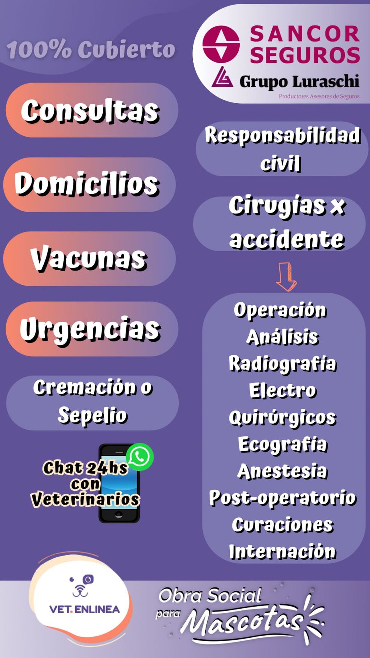 Vet en Línea es una obra social de Santa Fe que busca brindar cobertura veterinaria a nuestras mascotas en caso de que se enfermen o no podamos costear un tratamiento. Para comunicarse con Vet en Línea, podés llamar al 342-590-8426 o enviar un mensaje en Instagram: @vet.enlinea.