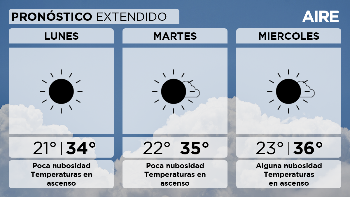 El lunes amaneció con el cielo vestido con la bandera argentina: celeste y con algunas nubes dispersas. La temperatura máxima estimada es de 34°. El pronóstico del tiempo indica que en el transcurso de la semana, las máximas irán en aumento.