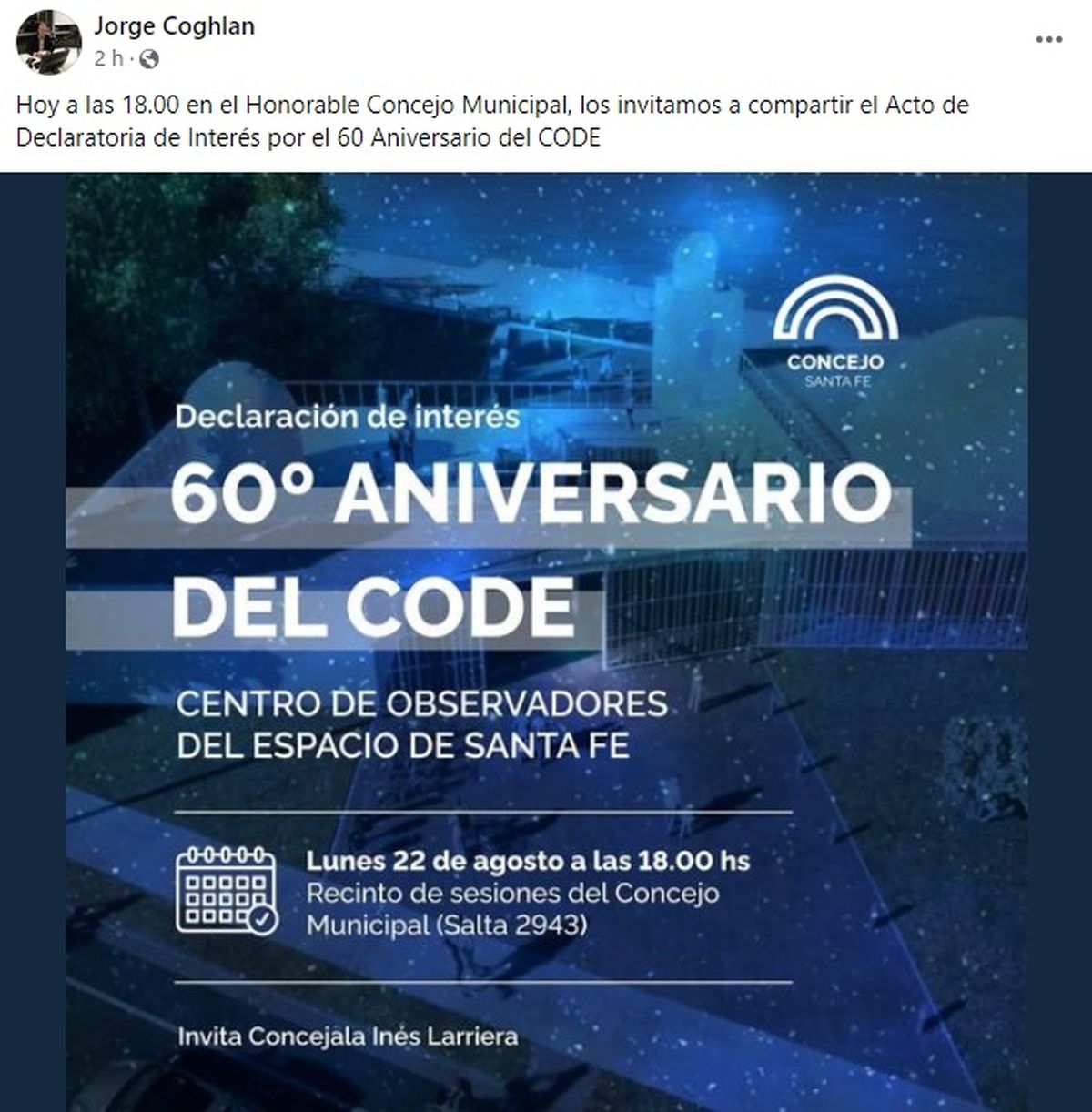 El Observatorio Astronómico y Museo del Espacio de Santa Fe (Code), cumple este lunes 60 años desde su primera fundación, en 1962. En 1993 se levantó el famoso edificio de la costanera. Esta tarde, a las 18 horas, el Concejo Municipal le entregará al director del edificio, Jorge Coghlan, una Declaración de Interés.