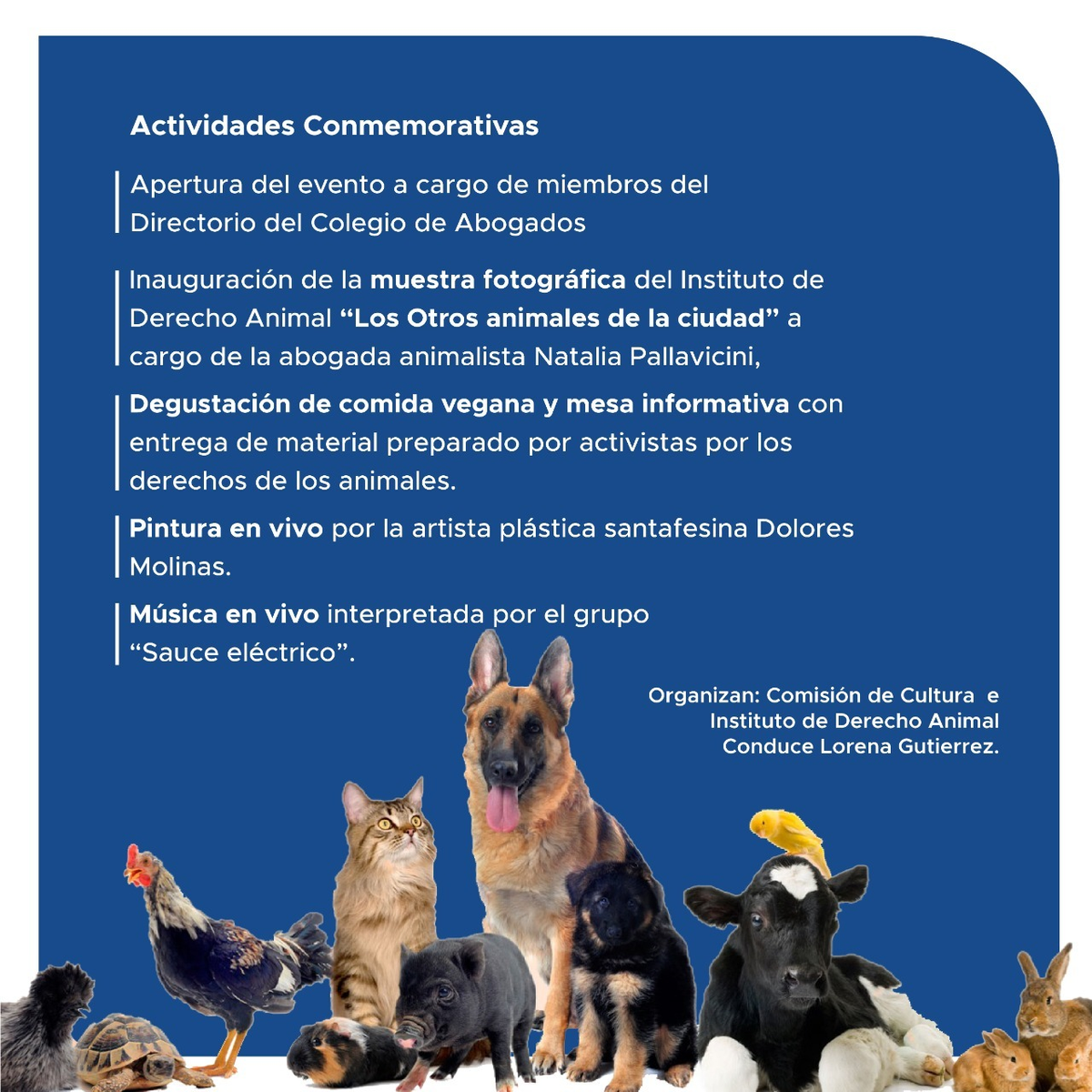 El Colegio de Abogados de Santa Fe, a través de su Comisión de Cultura y de su Instituto de Derecho Animal, realizará una jornada conmemorativa por el Día del Animal no humano. Será el 29 de abril a las 17 en el Salón Parera del Colegio de Abogados de Santa Fe, ubicado en calle 3 de Febrero 2761 de la ciudad de Santa Fe. La entrada es libre, gratuita y destinada al público en general.