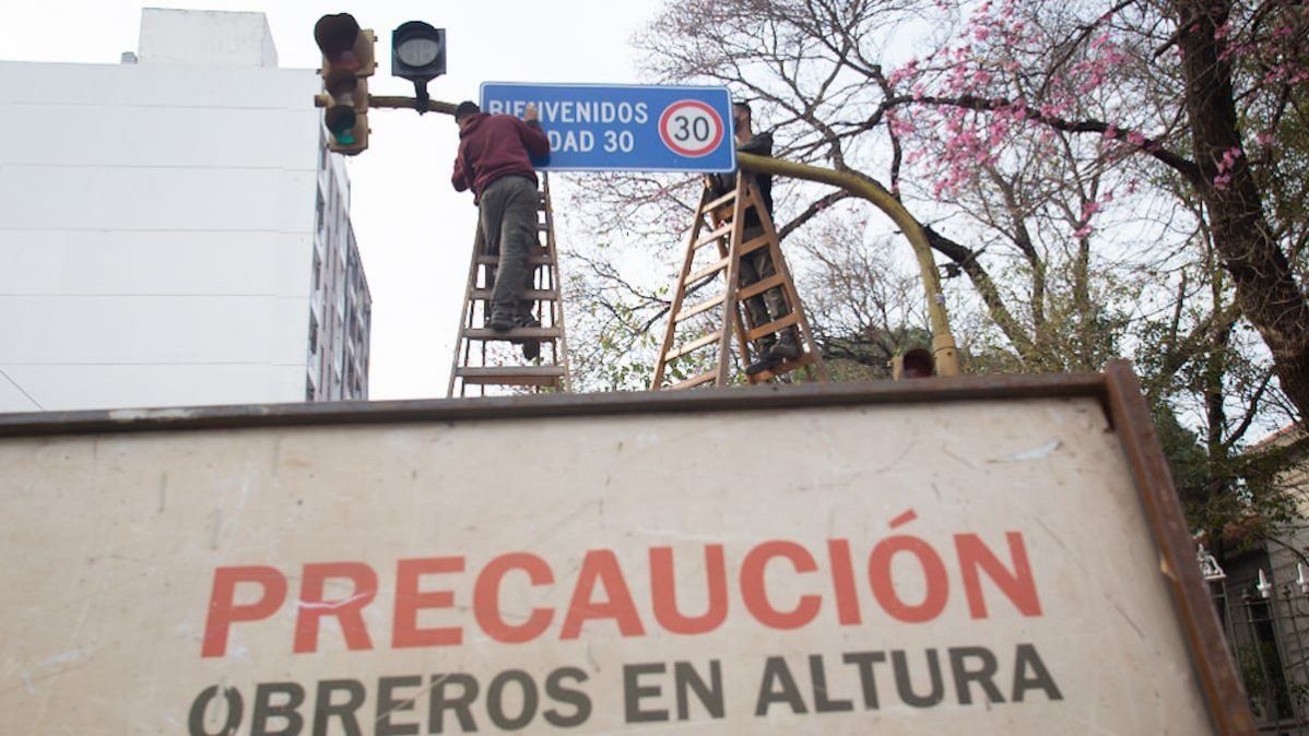 "Bienvenidos Ciudad 30", disponen los carteles que este viernes a la mañana colocaron en la intersección de Urquiza y Mendoza.