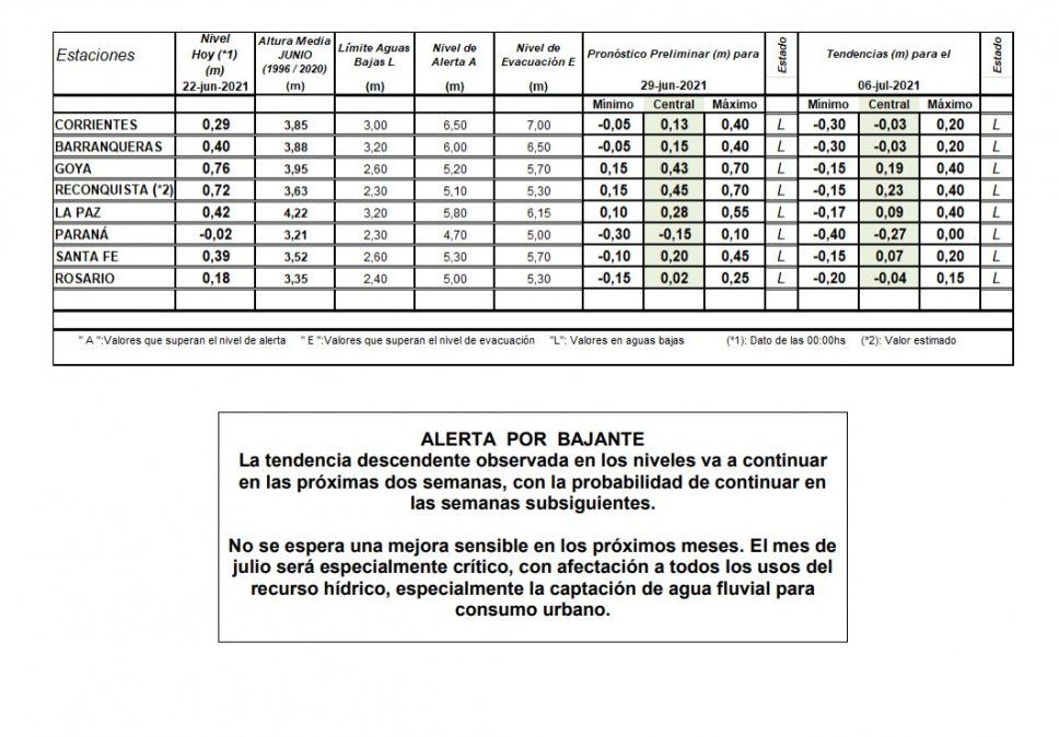 En la proyección “de mínima” del INA -que se publicó este martes 22 de junio- se advierte que la bajante podría perforar el cero del hidrómetro en el puerto santafesino en los próximos días. La última vez que esto sucedió fue en 1969 (- 0,14 metros).