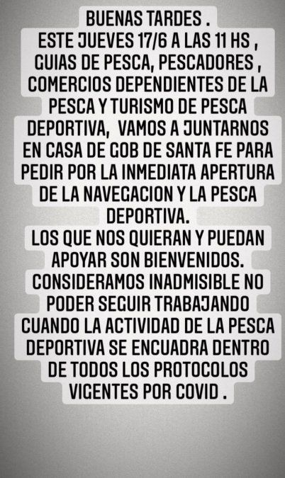 Frente a esta situación, guías, pescadores y comercios dependientes de la pesca deportiva se concentrarán este jueves 17 de abril desde las 11 frente a la Casa de Gobierno de Santa Fe. "Vamos a juntarnos para pedir por la inmediata apertura de la navegación y la pesca deportiva. Los que nos quieran y puedan apoyar son bienvenidos. Consideramos inadmisible no poder seguir trabajando cuando la actividad de la pesca deportiva se encuadra dentro de todos los protocolos vigentes por covid", explica el flyer que se difunde por WhatsApp y otras redes sociales convocando a la movilización.