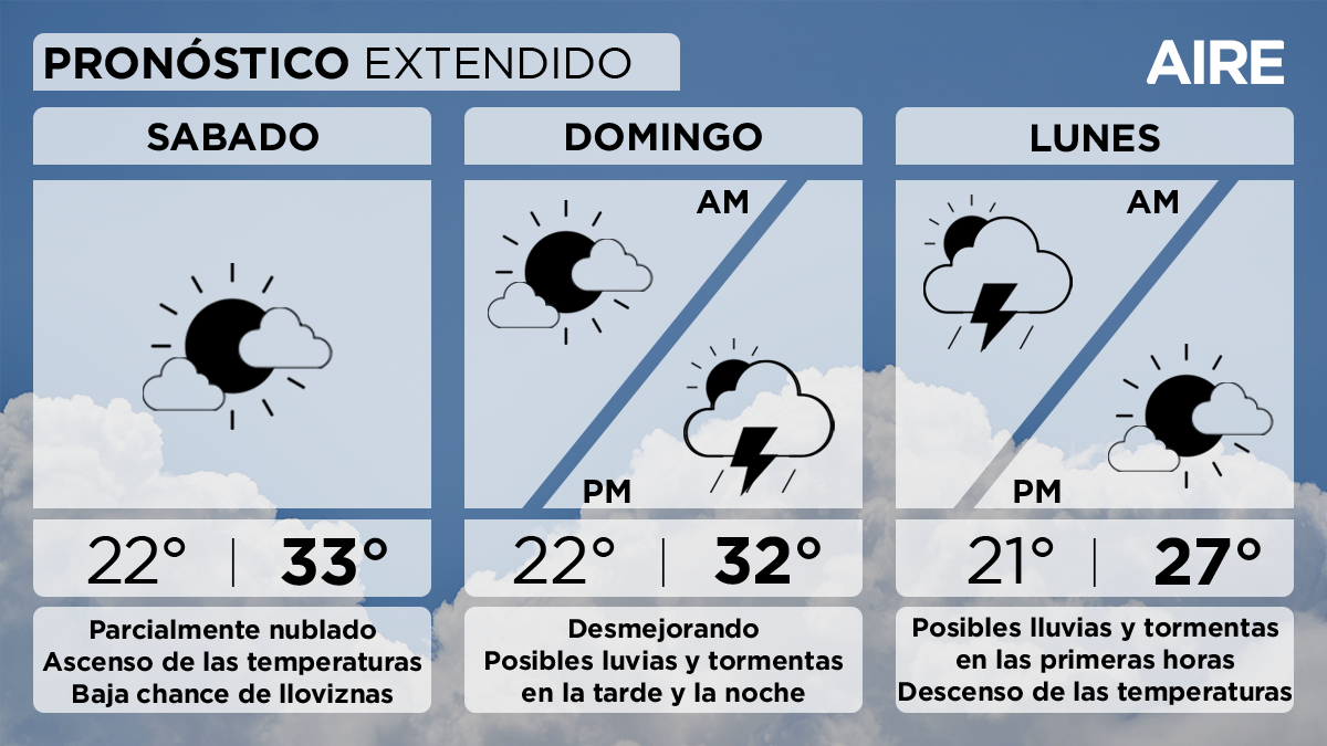 El domingo comenzará con cielo parcialmente nublado, pero desmejorando desde la tarde con posibles lluvias y tormentas aisladas, sobre todo hacia la noche. Temperatura mínima de 22°, máxima de 32° con elevada sensación térmica, y viento leve a moderado del noreste.