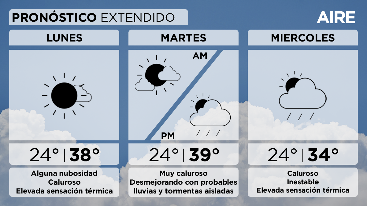 El martes las condiciones irán desmejorando con nubosidad en aumento y probables lluvias y tormentas aisladas desde la tarde. Temperatura mínima de 24°, máxima de 39° y viento leve del este rotando al norte rotando al sur.