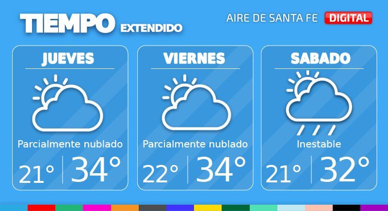 El sábado también habrá condiciones inestables con un cielo que predominará parcialmente nublado y con baja probabilidad de precipitaciones. La temperatura mínima será de 21°, la máxima de 32° y habrá viento leve del sudeste.